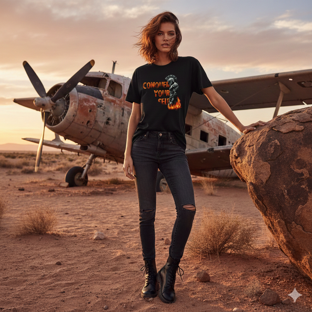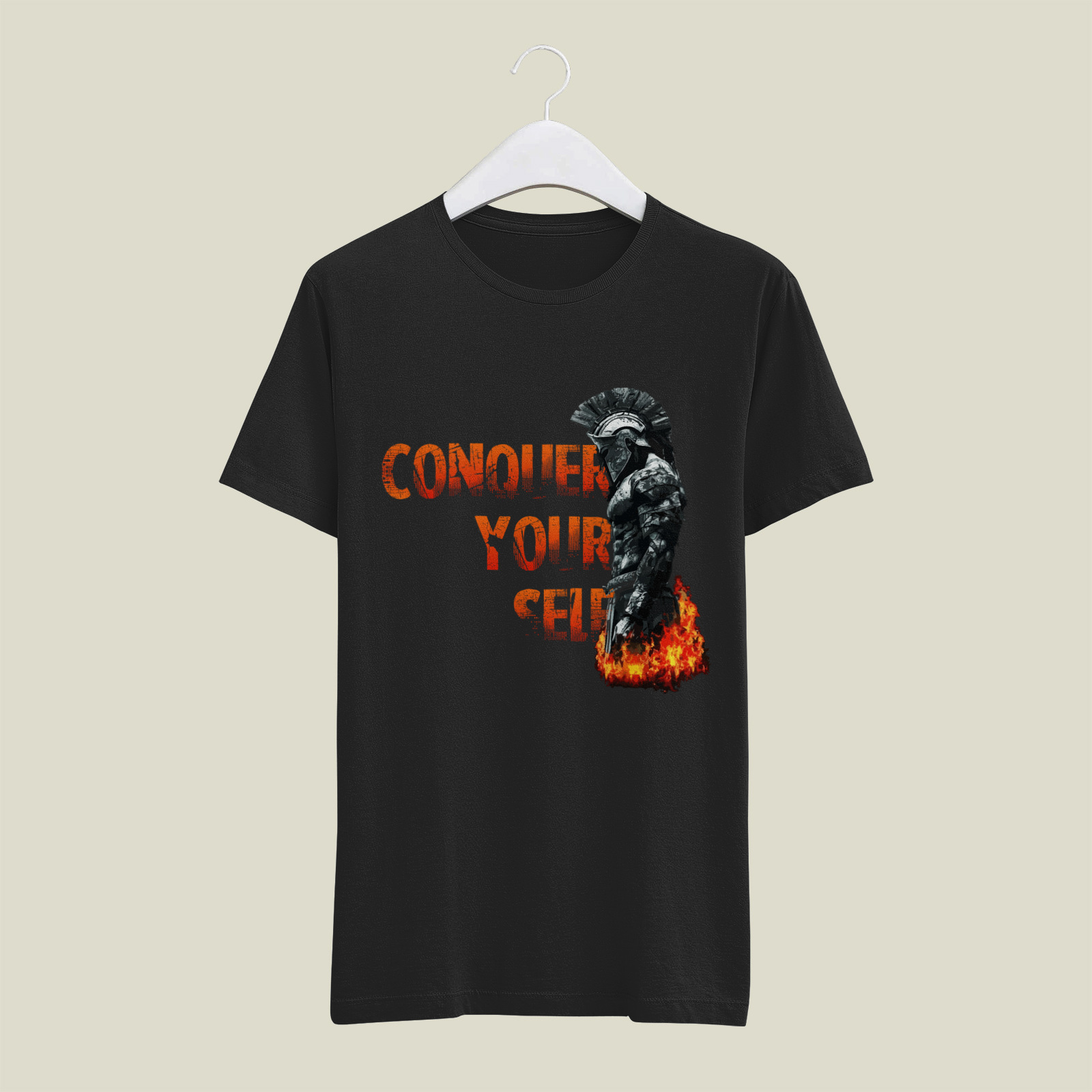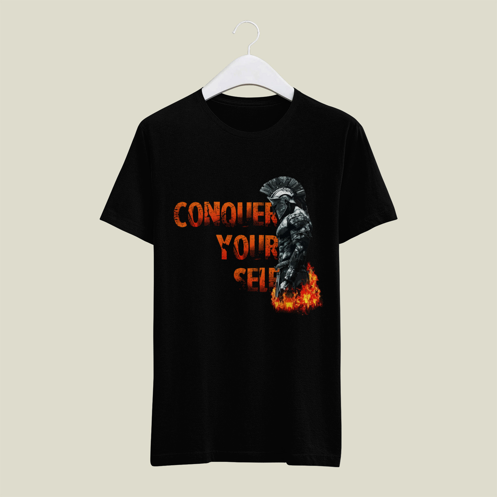 A philosophical design showing a warrior figure amidst fire, highlighting the ultimate battle of self-discipline and the mastery of one’s own mind and impulses.