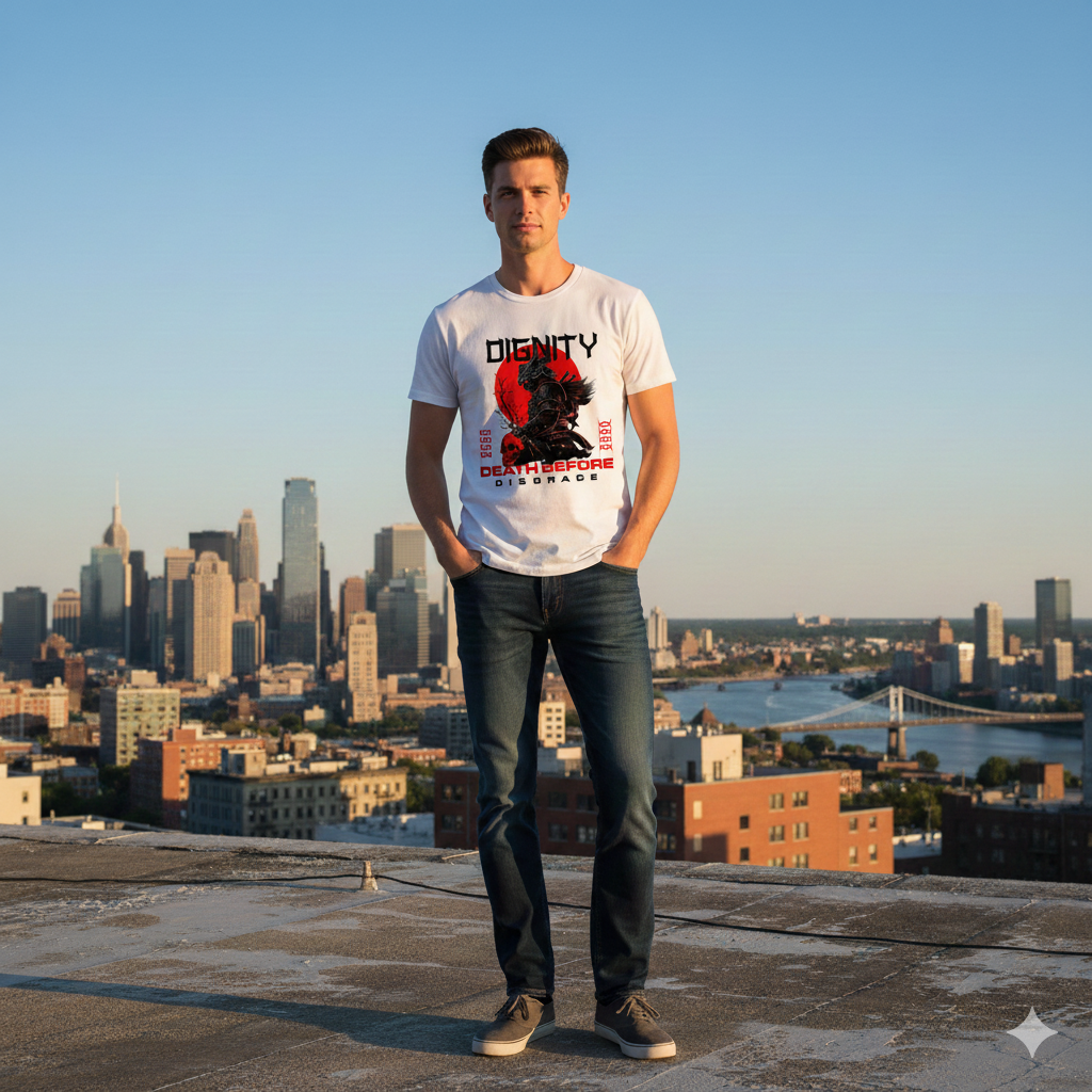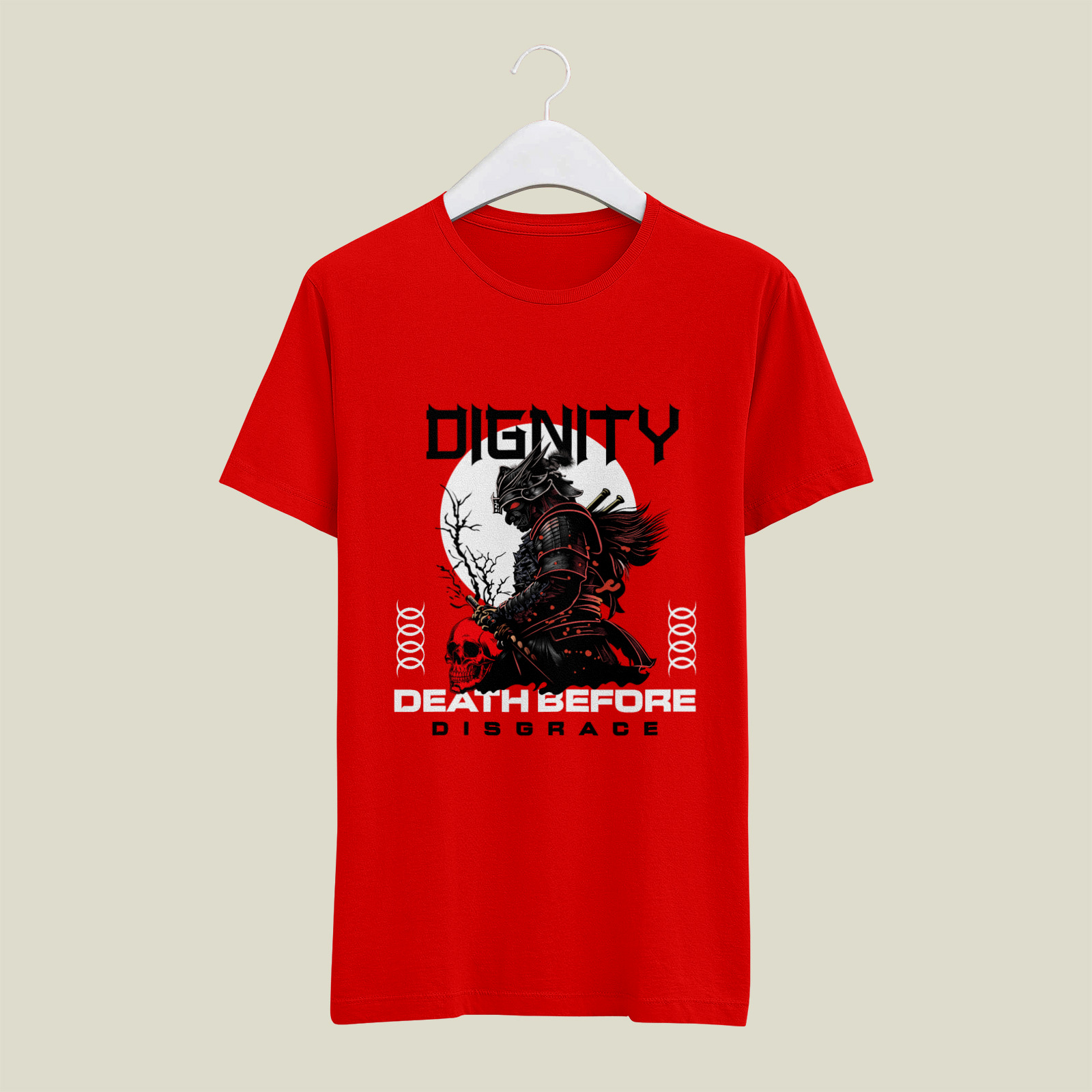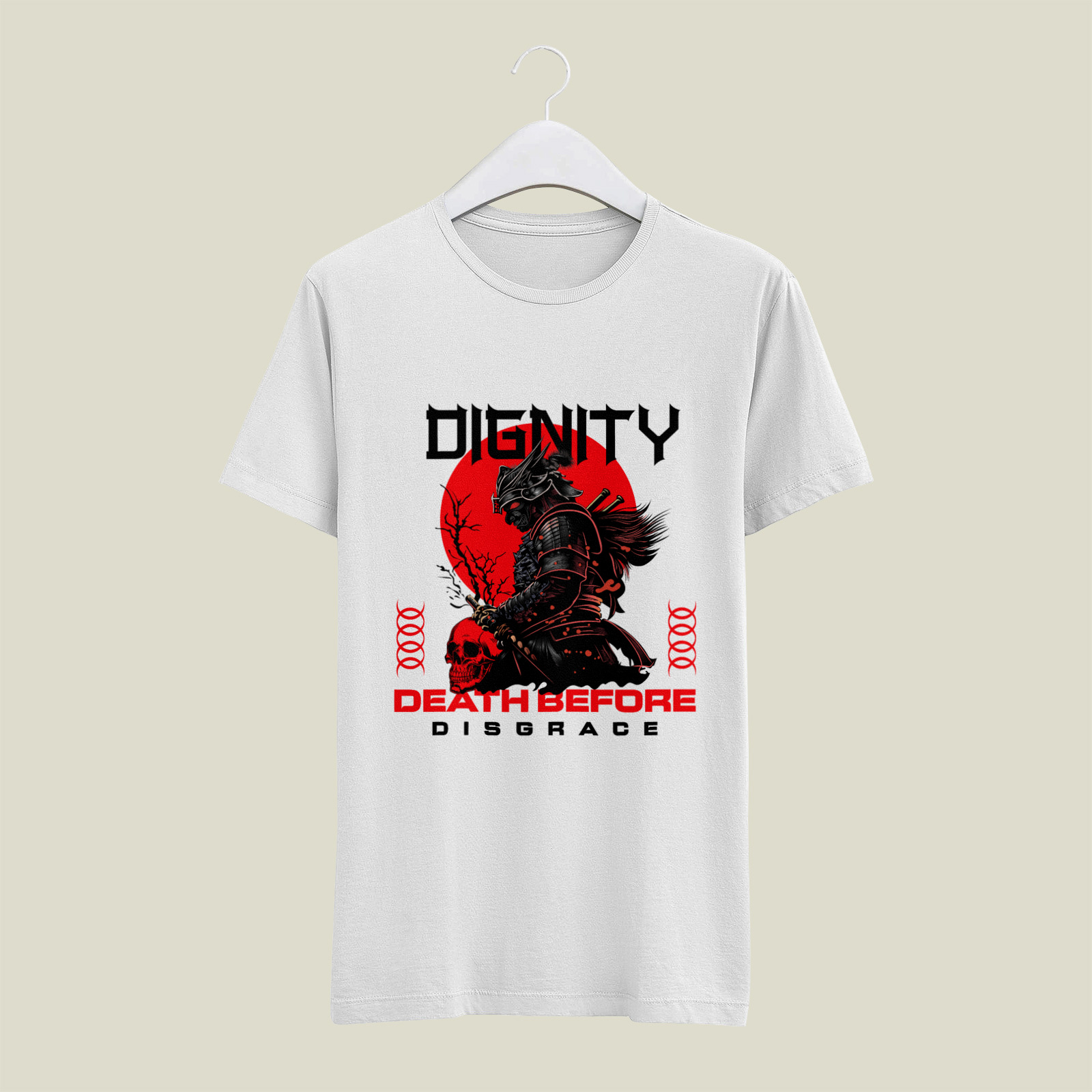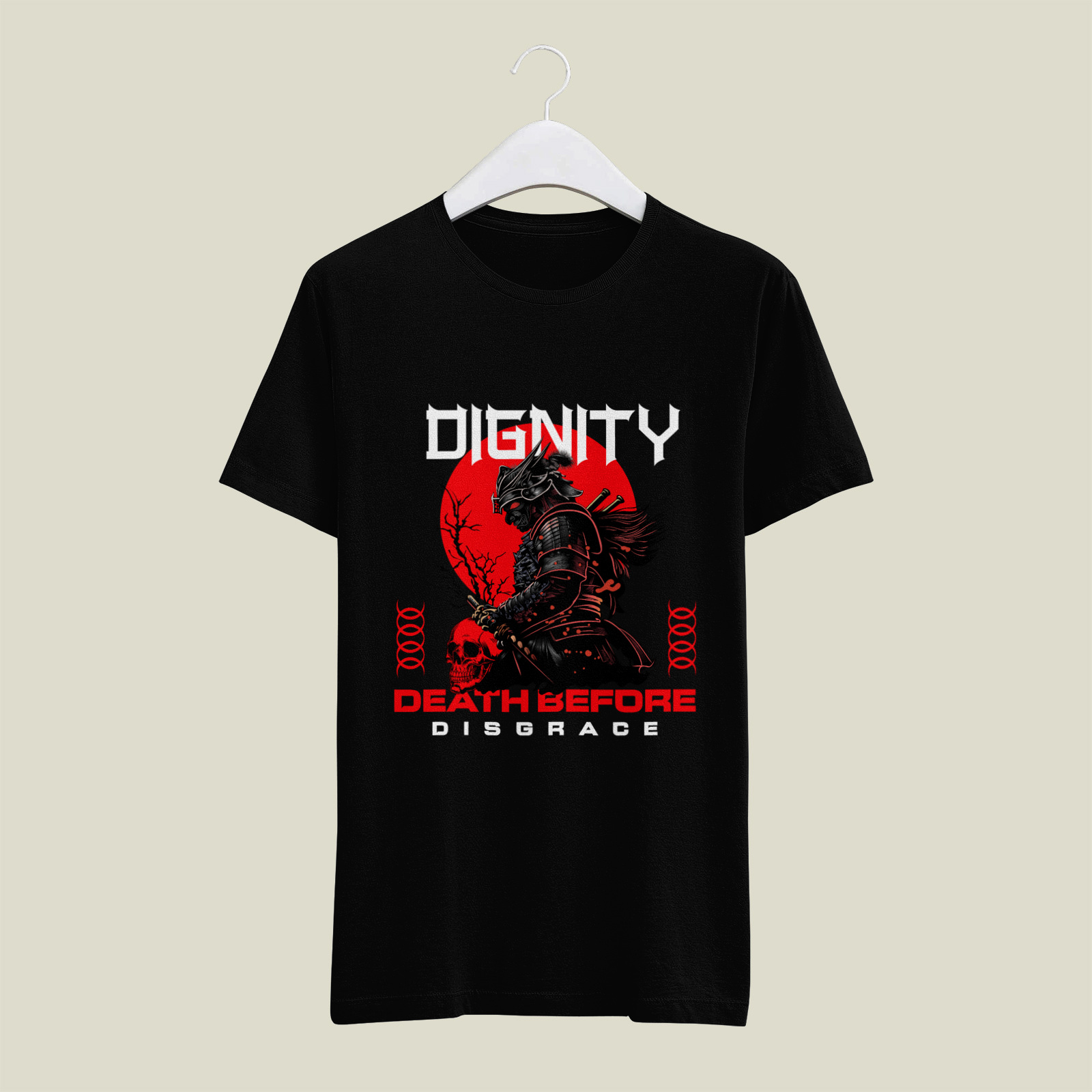 A Japanese-inspired graphic featuring a samurai silhouette against a rising sun, accompanied by text emphasizing the code of honor, dignity, and integrity.