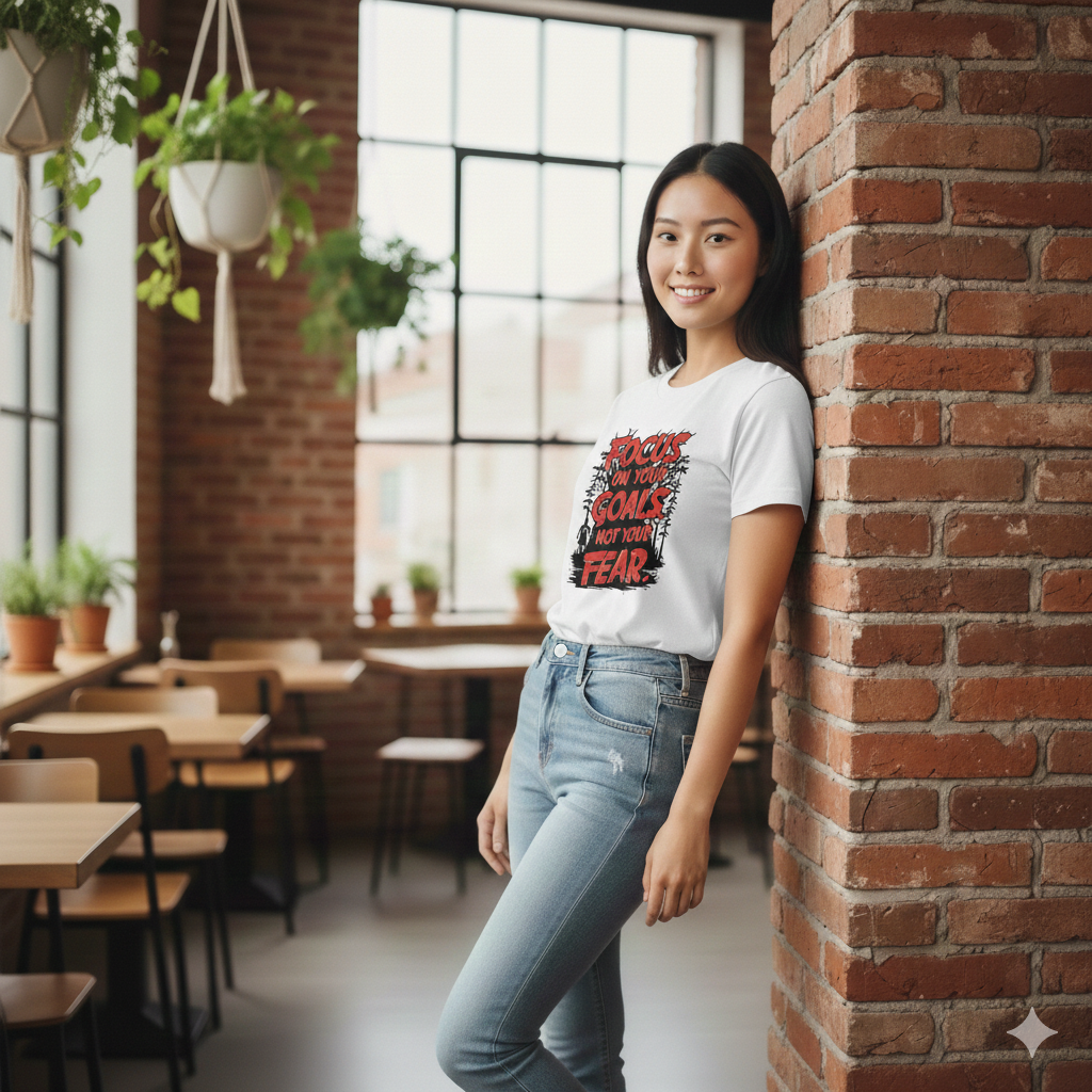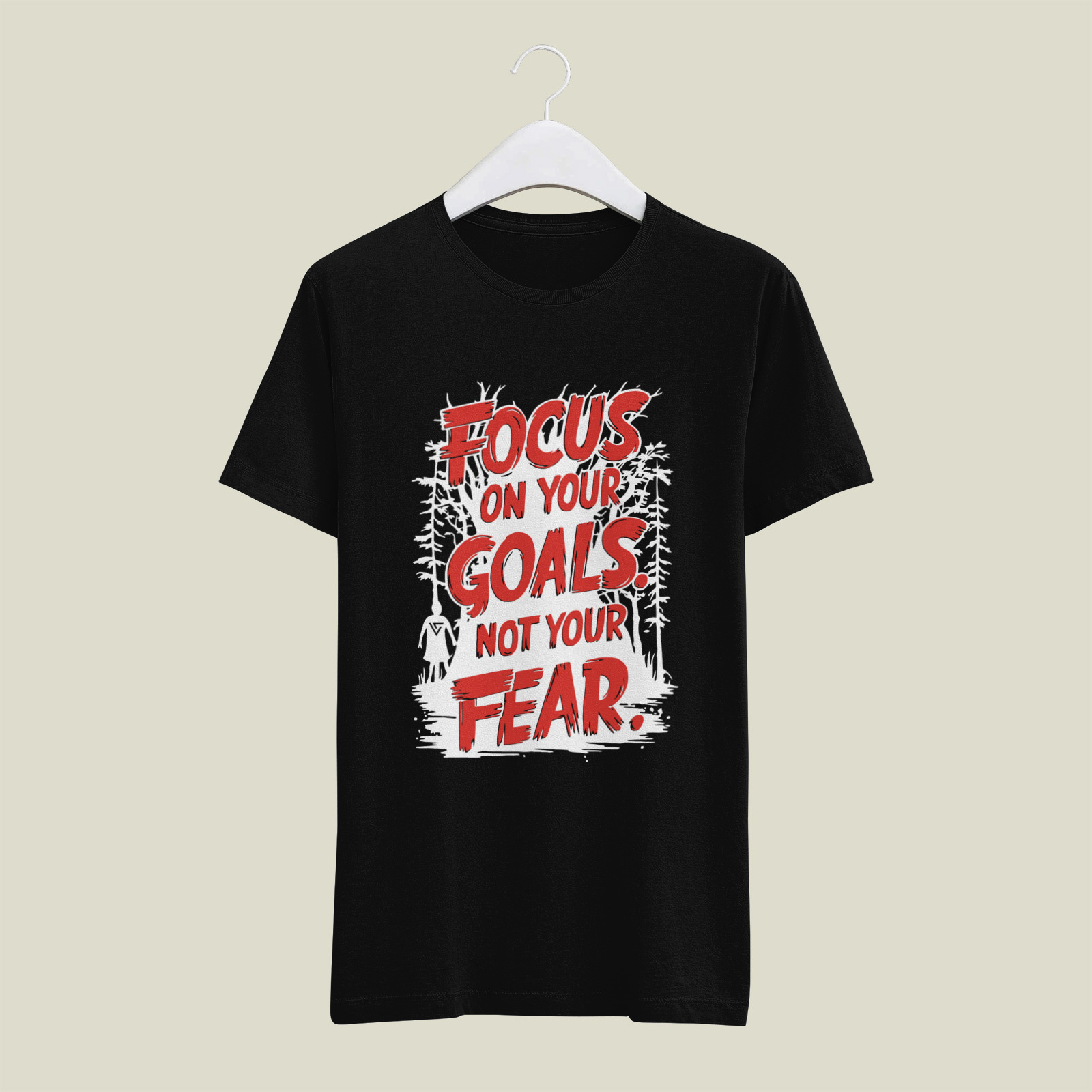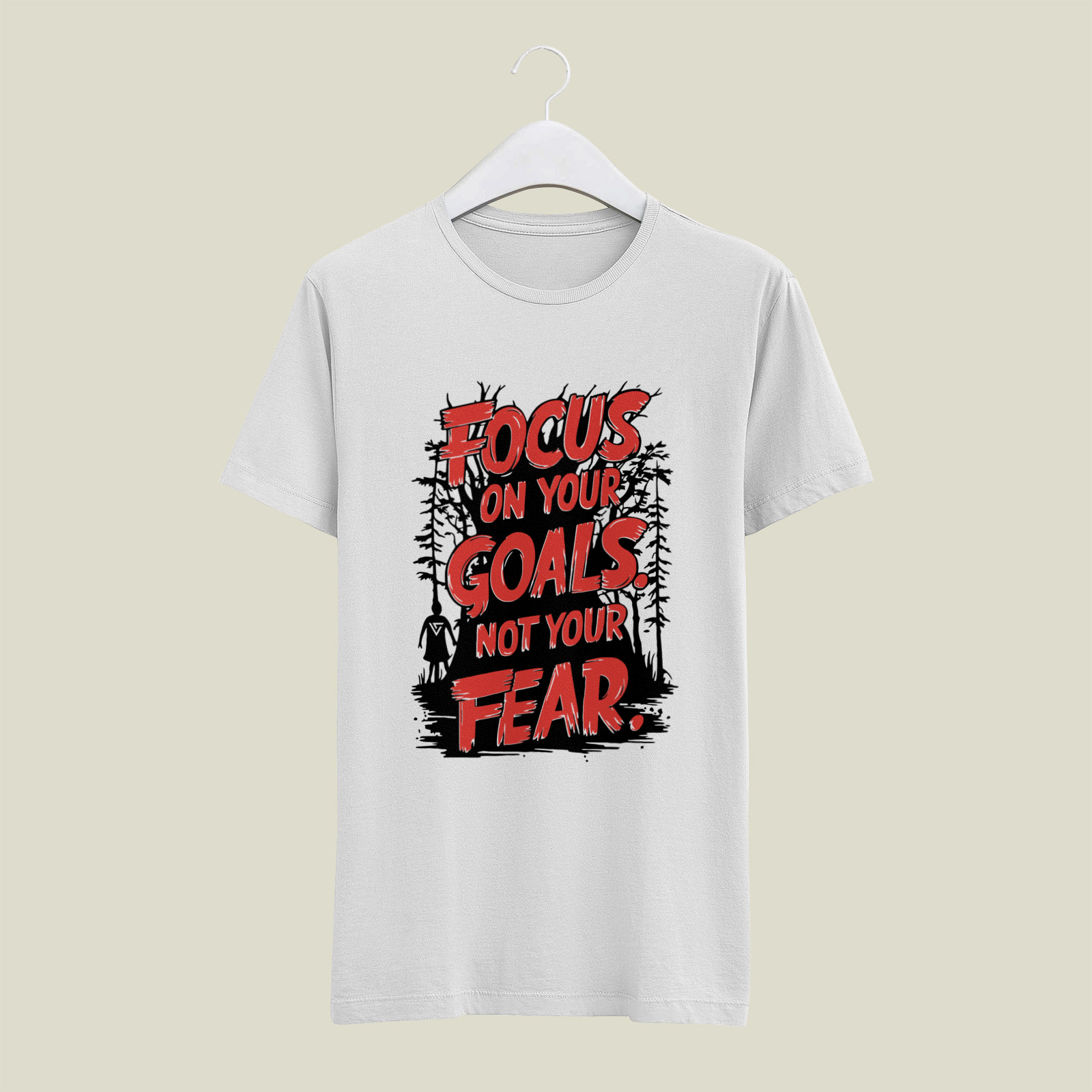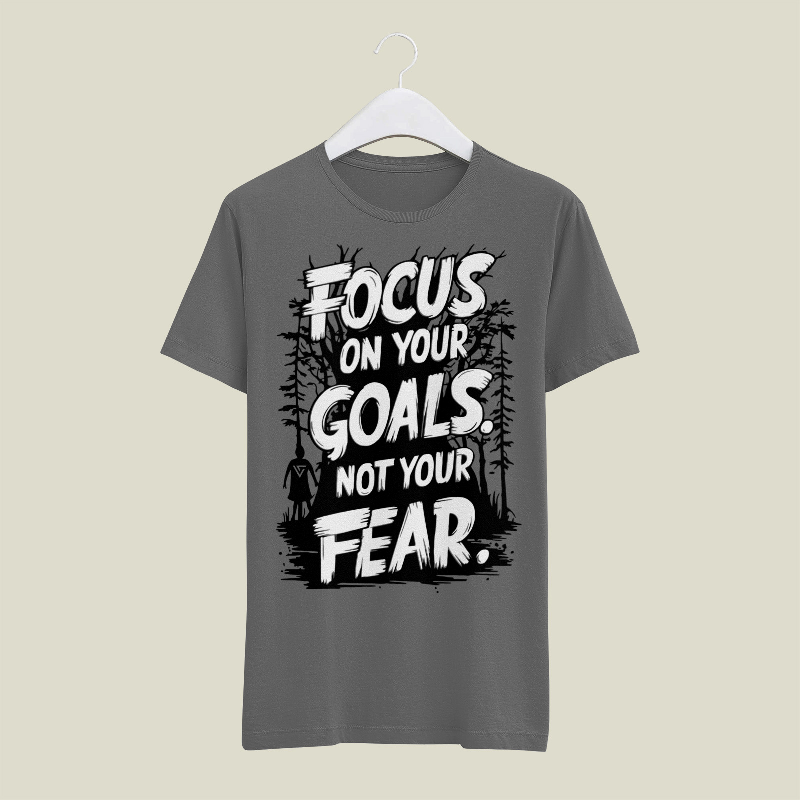 An illustrative design with bold, layered text set against a forest backdrop, encouraging the wearer to prioritize ambition over fear.