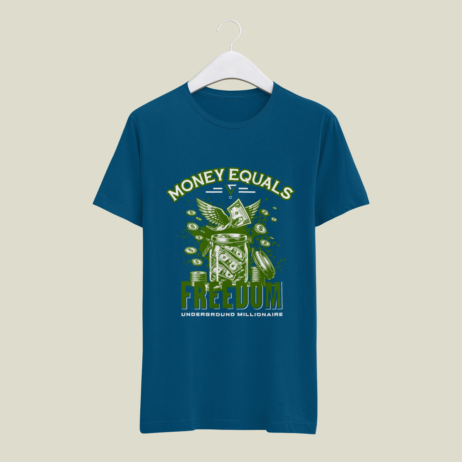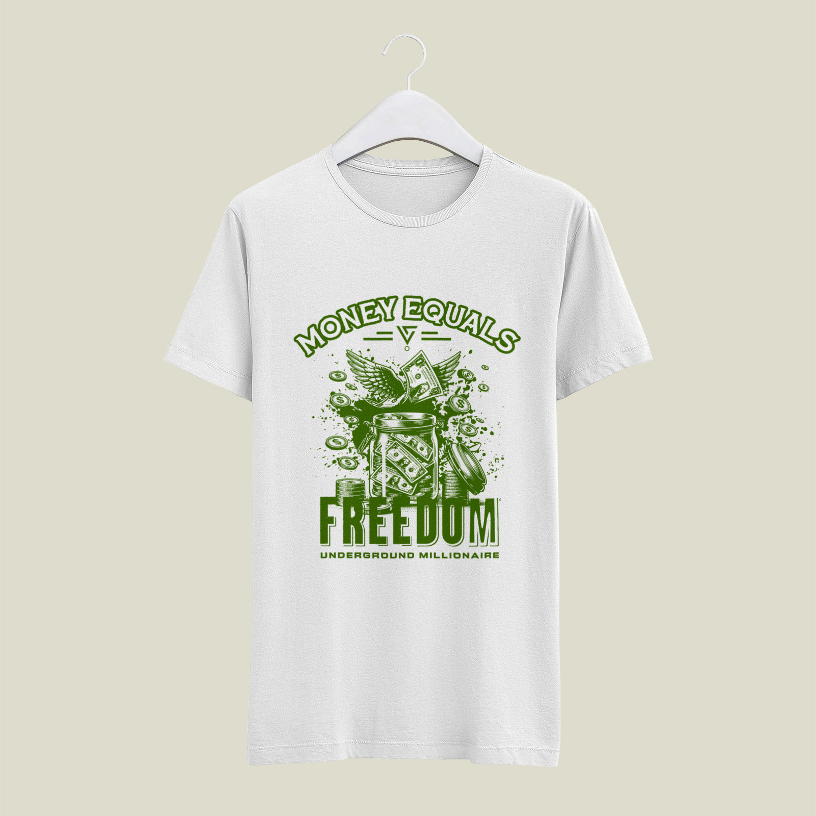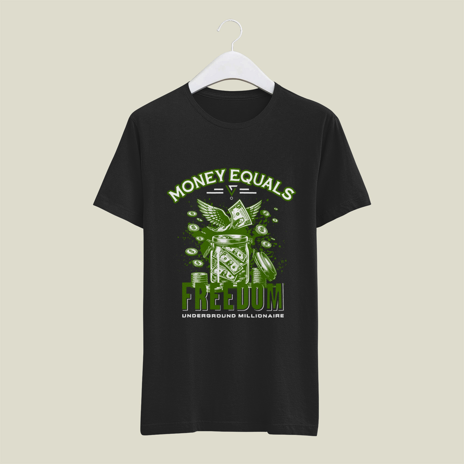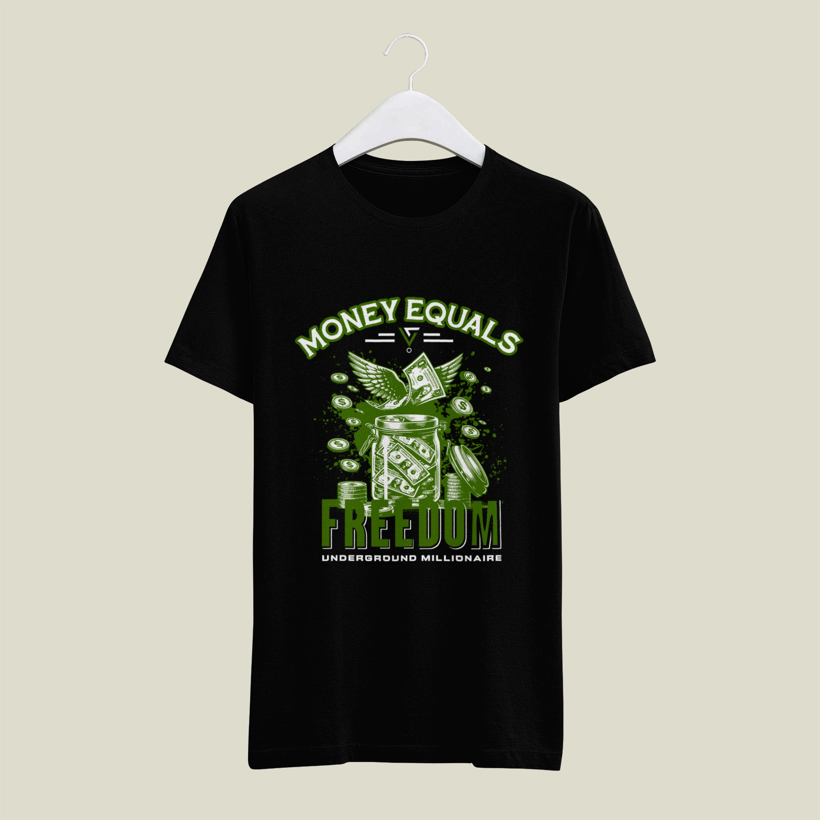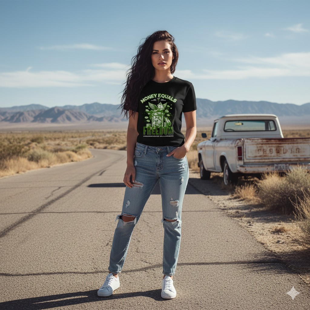 A provocative graphic featuring flying currency and wealth imagery, boldly stating a perspective on financial independence and the liberty it provides.