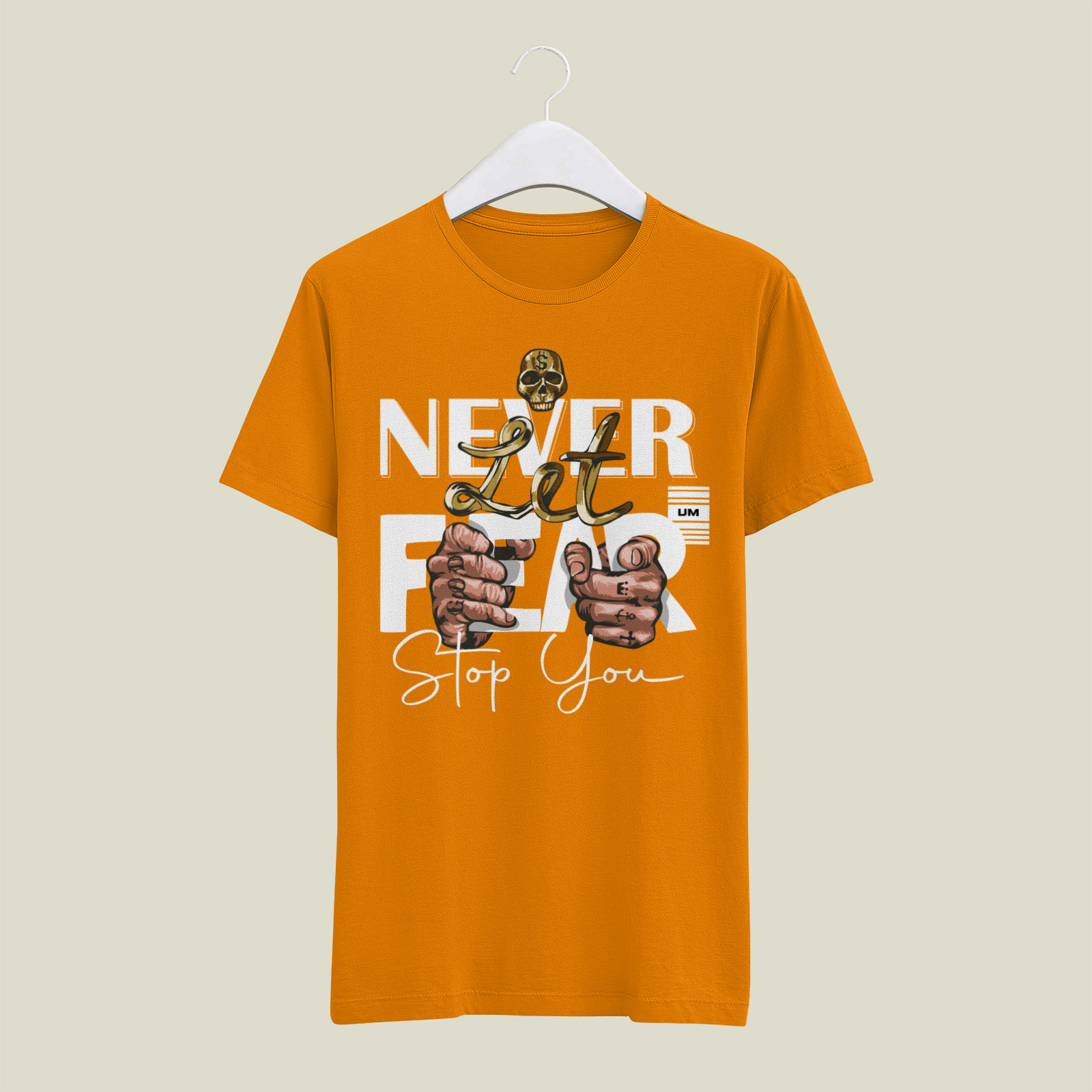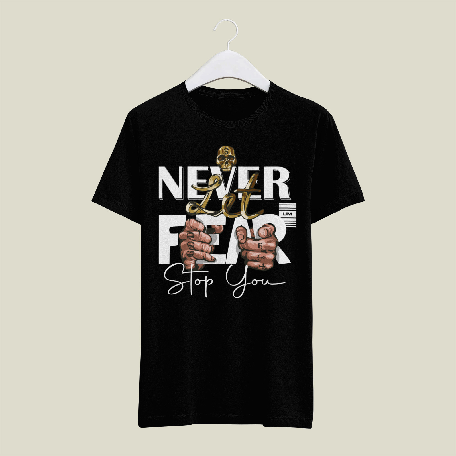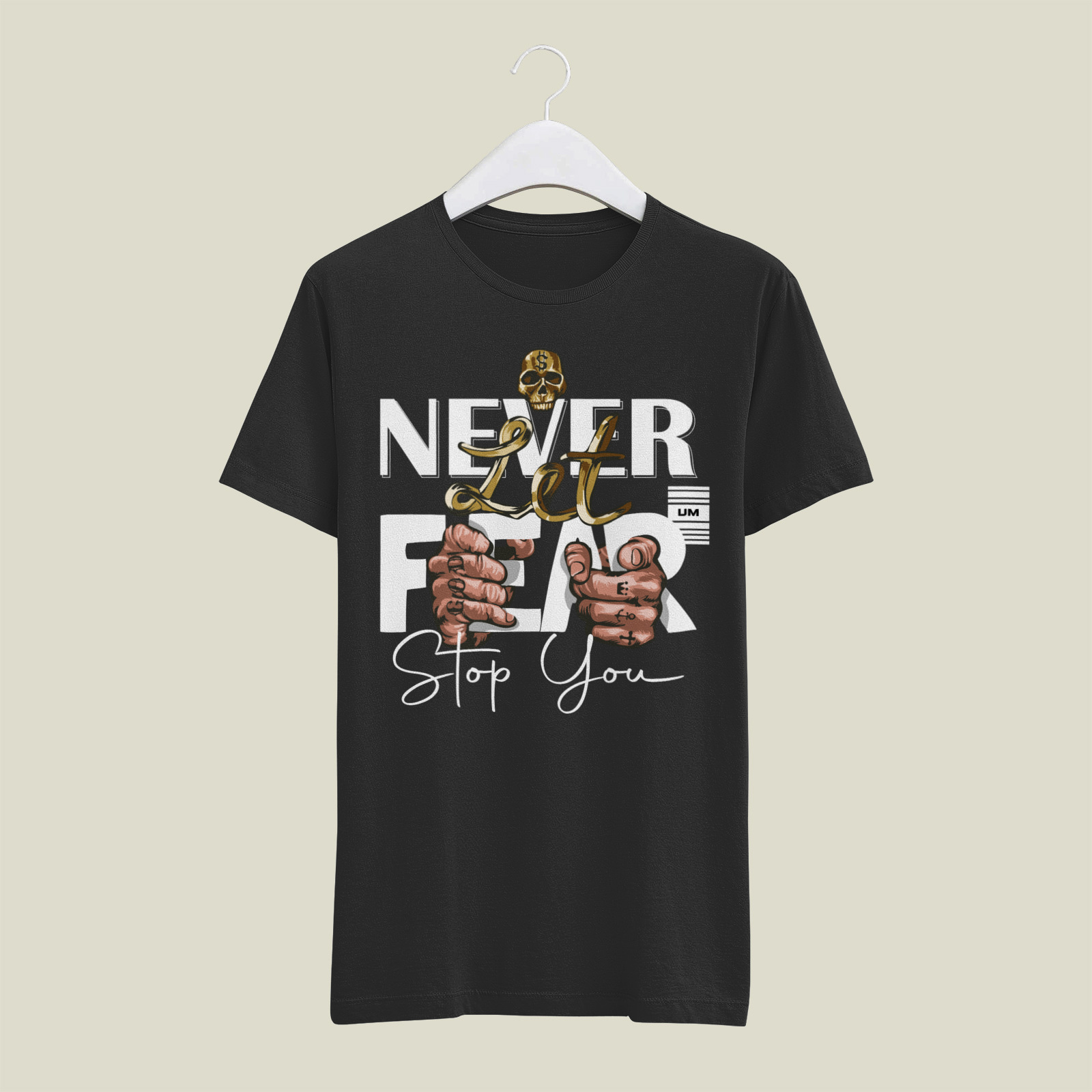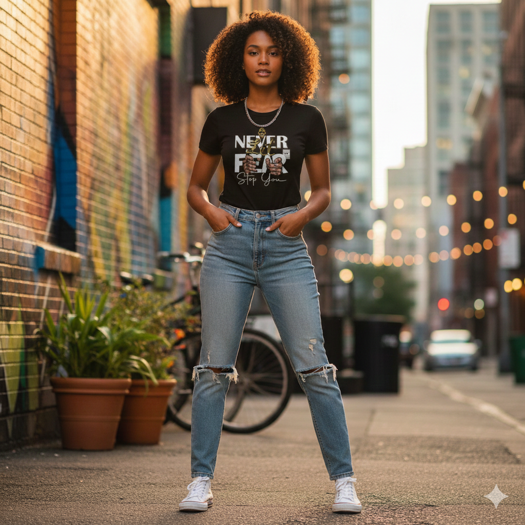 A bold graphic emphasizing courage, featuring hands interacting with metallic gold elements and striking typography that encourages the wearer to overcome internal and external barriers.
