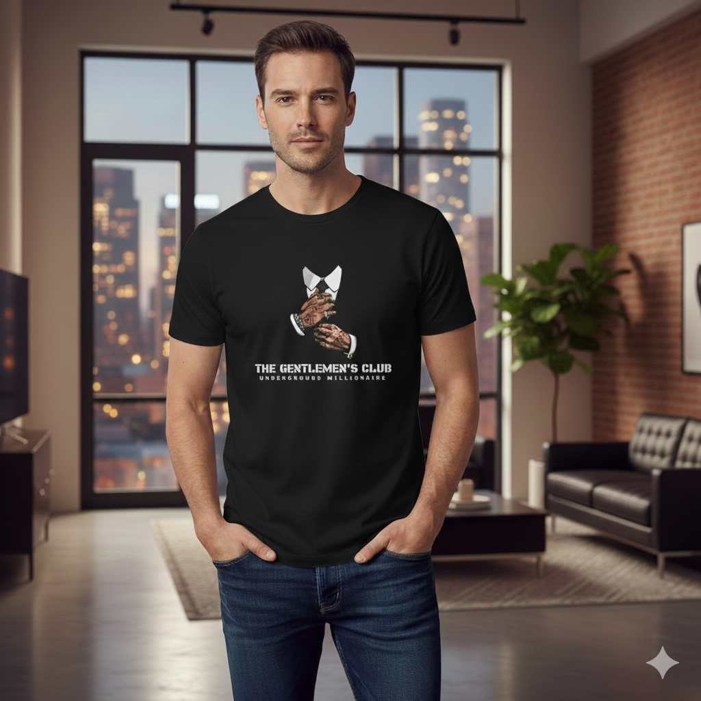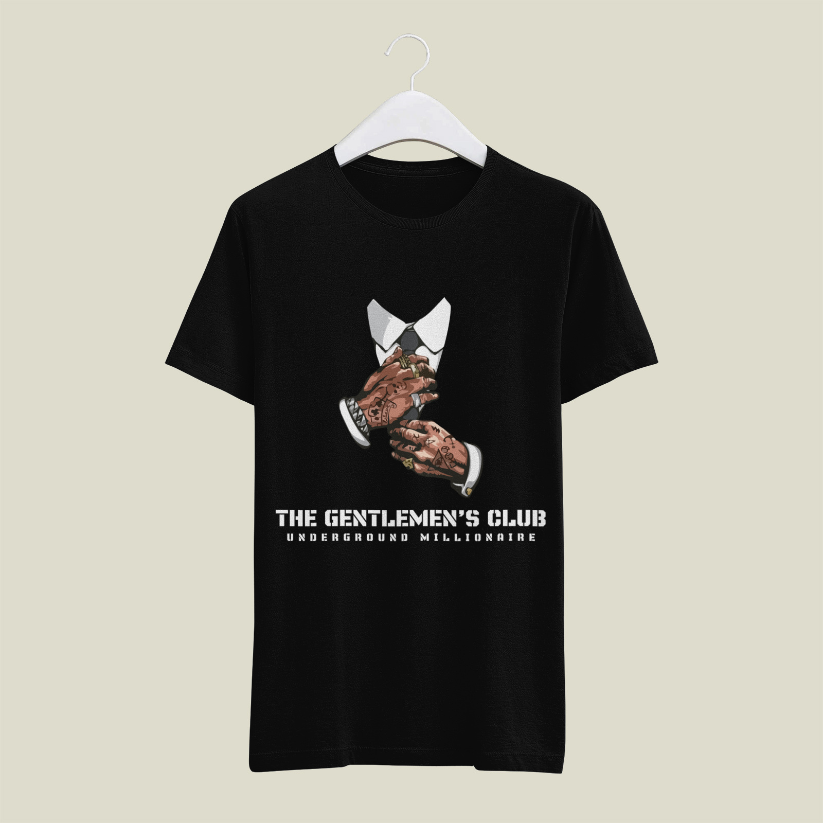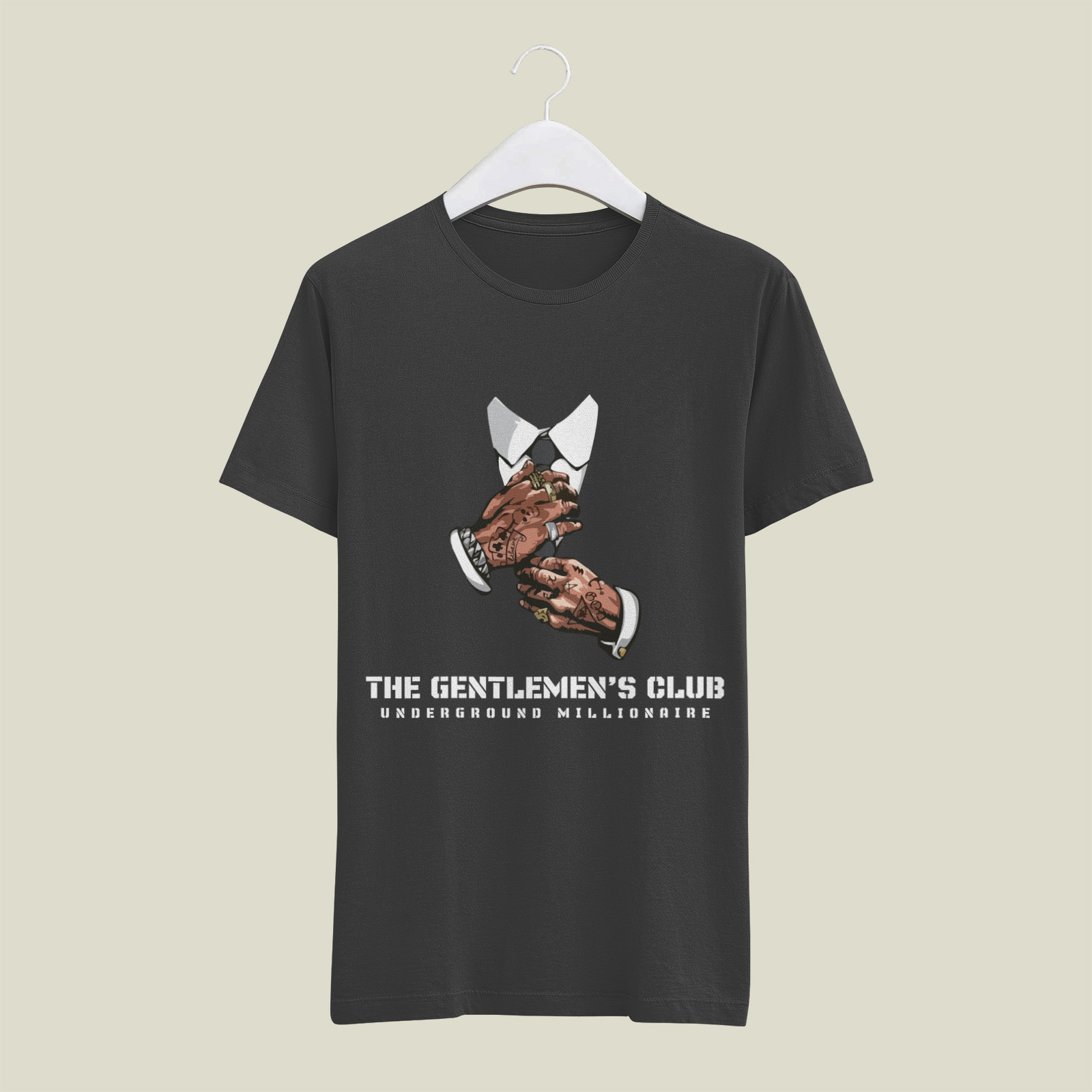A minimalist design featuring a pair of tattooed hands adjusting a formal collar and tie, conveying a sense of gritty sophistication and underground success.